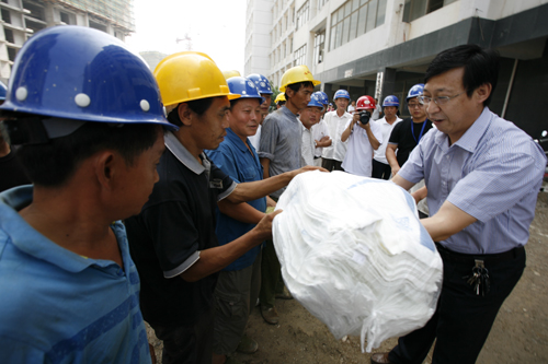 日前,我公司積極響應(yīng)市總工會(huì)號召,組織開展“關(guān)愛職工.夏送清涼”活動(dòng),為全公司4000余名農(nóng)民工送去T桖衫、毛巾,并為每個(gè)工地送去1000余斤西瓜及其他消暑物品。