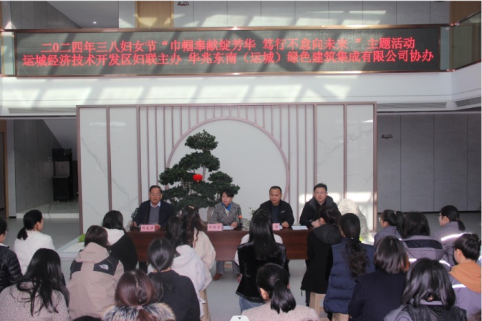 陽春三月天,春花展新顏。3月8日,為慶祝第114個“三八”國際婦女節(jié),弘揚時代精神,展示巾幗風采,由運城經(jīng)濟技術開發(fā)區(qū)婦聯(lián)主辦,華兆東南綠建承辦的“巾幗奉獻綻芳華 篤行不怠向未來”活動在裝配式建筑產(chǎn)業(yè)基地召開。開發(fā)區(qū)黨工委副書記黃梅芳,人力資源部部長何光華,華兆東南綠建總經(jīng)理王永學等參加此次活動。